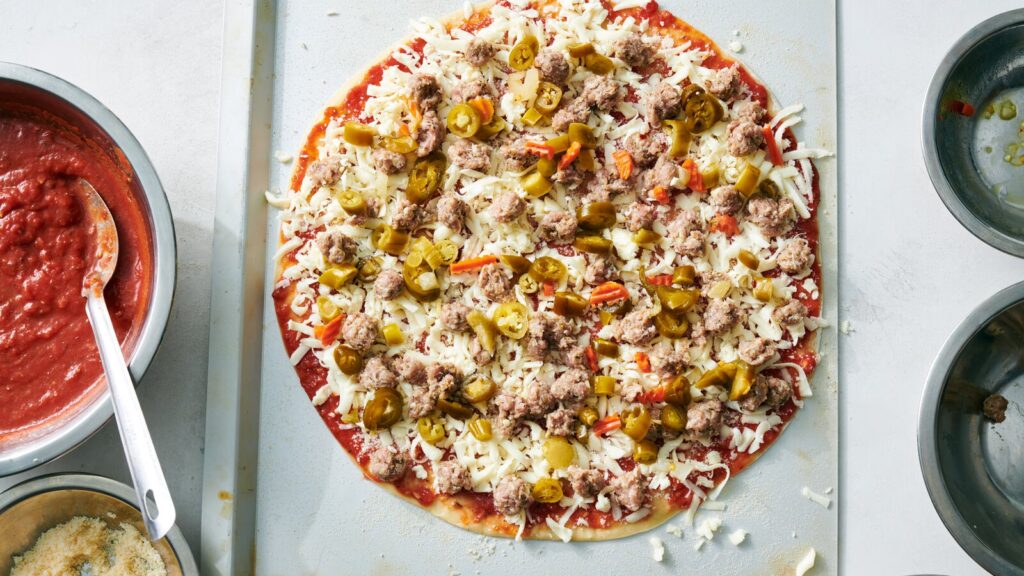 - Dodawanie kiełbasy: Weź około jednej dużej łyżki surowej kiełbasy i układaj ją w małych kuleczkach lub szczyptach wokół brzegu pizzy.