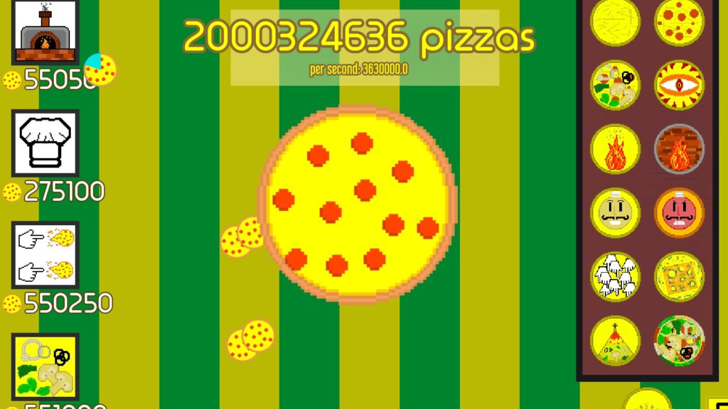 - Strategia: Twoim celem jest pieczenie jak największej liczby pizz w jak najkrótszym czasie. Oznacza to ciągłe inwestowanie w ulepszenia. Zazwyczaj opłaca się dążyć do kupowania droższych ulepszeń, które oferują większy zwrot z inwestycji, a następnie uzupełniać je tańszymi, aby maksymalnie zwiększyć produkcję. Pamiętaj, że Twoje własne kliknięcia zawsze będą ważnym czynnikiem, nawet gdy masz już wiele automatycznych źródeł dochodu.