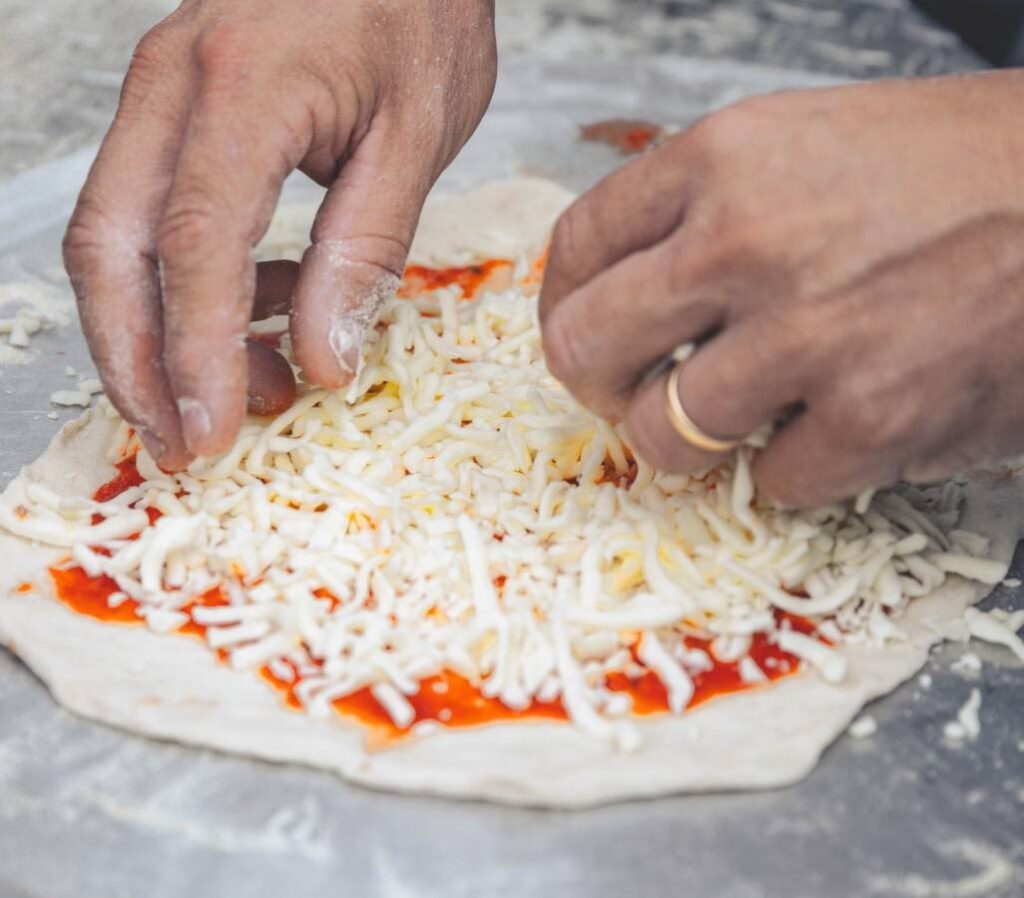 - Aby utrzymać dodatki na miejscu, lekka posypka Parmigiano Reggiano, Grana Padano lub innego twardego sera o wysokiej temperaturze topnienia, dodana na wierzch pizzy przed pieczeniem, może działać jak "klej". Pomaga to chronić dodatki przed spadaniem podczas procesu pieczenia i przenoszenia pizzy.