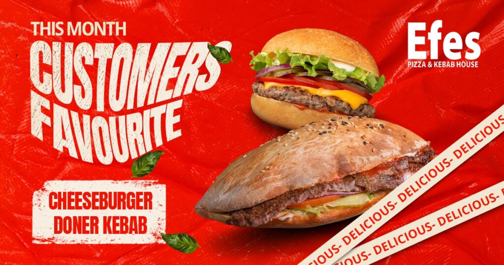 Efes oferuje szeroki wybór pizz, różnorodne burgery, wrapy, chlebki czosnkowe oraz dodatki. Kebab doner jest również w menu, choć z mieszanymi opiniami.
