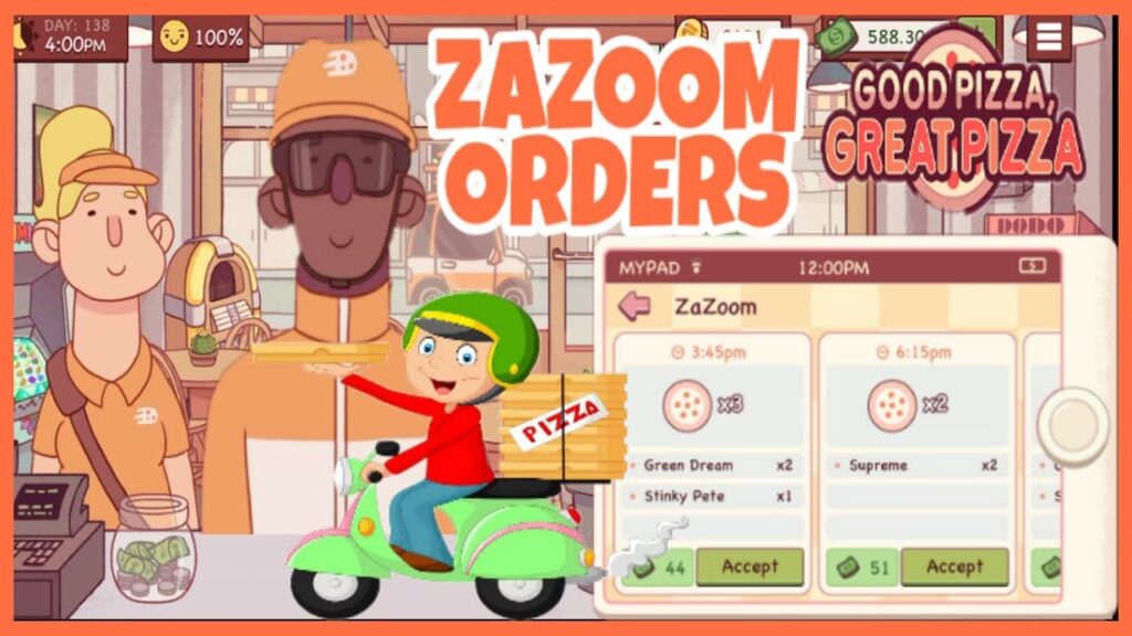 Jednym z najbardziej ekscytujących i jednocześnie wymagających aspektów Good Pizza, Great Pizza jest system dostaw ZaZoom. Ta innowacyjna aplikacja, stworzona przez Rufusa Goldworthy'ego, staje się dostępna od momentu odblokowania Rozdziału 3. ZaZoom wprowadza do gry nowy wymiar strategicznego planowania i zarządzania czasem, ponieważ nie tylko musicie dbać o klientów stacjonarnych, ale także o tych zamawiających online.