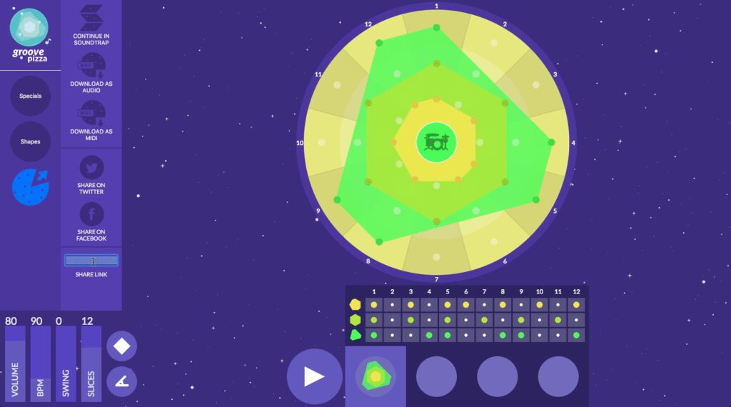 - Eksploruj Kształty: Jeśli chcesz zagłębić się w matematyczne aspekty, przejdź do zakładki „Shapes” (Kształty) w wersji webowej. Przeciągaj różne geometryczne kształty (takie jak kwadraty, trójkąty, pięciokąty) na okrąg „pizzy”. Każdy kształt generuje unikalny wzorzec rytmiczny, co jest fascynującym sposobem na wizualizację i zrozumienie, jak geometria może tworzyć muzykę. To pozwala na wizualne myślenie o rytmie i odkrywanie relacji między formą a dźwiękiem.