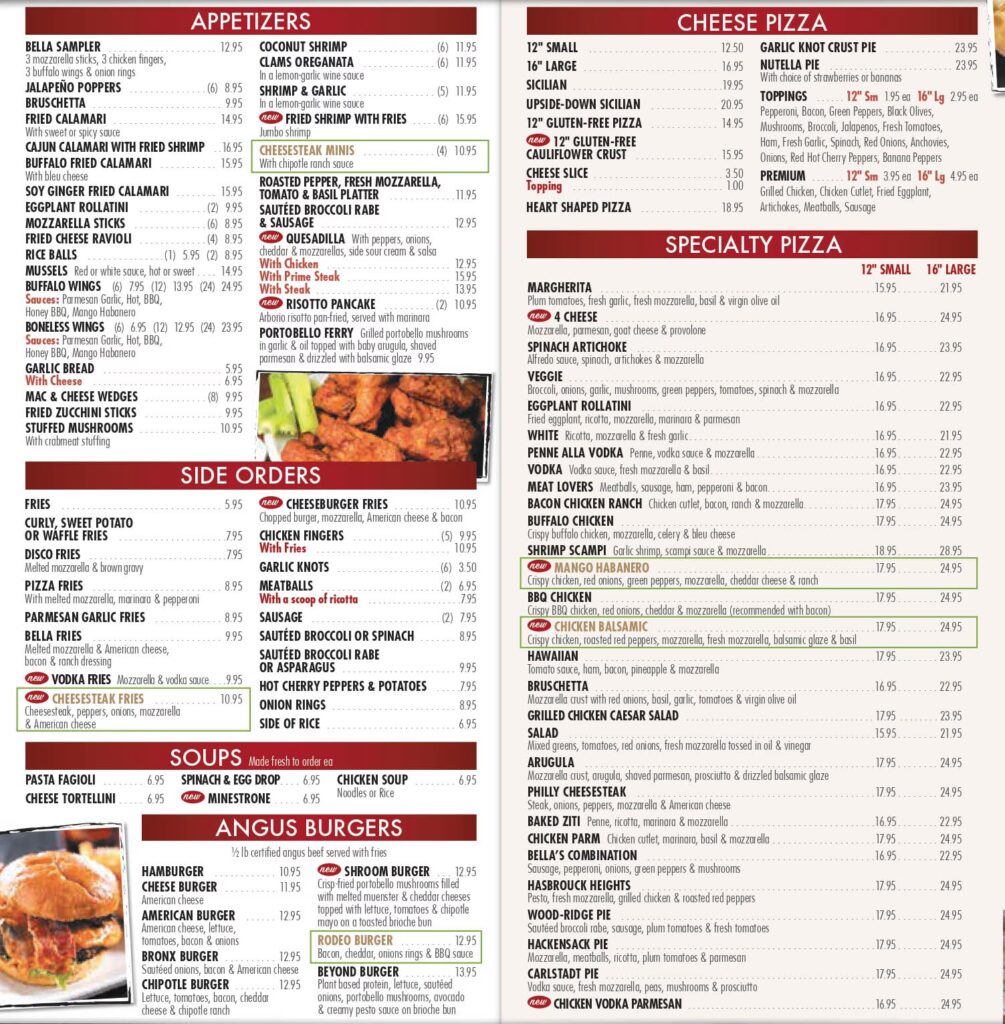 Contact Bella Pizza by Phone Today at (201) 426-0998 or Order Online Now! Copyright © Bella Pizza. All Rights are Reserved. Looking for a place to stop in on your lunch break? A Family dinner with your loved ones? Or need a few pies for the big game?