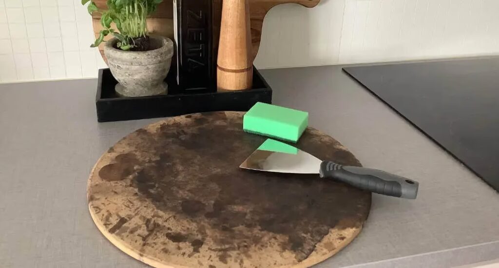 - Krok 2: Zeskrobywanie resztek. Użyj plastikowej szpatułki, skrobaka do ciasta, starej karty kredytowej (której już nie potrzebujesz) lub specjalnej szczotki do czyszczenia kamienia do pizzy z twardym włosiem, aby delikatnie zeskrobać wszelkie przypalone resztki jedzenia, sera czy sosu. Staraj się nie używać metalowych narzędzi, które mogłyby porysować powierzchnię kamienia, tworząc mikrouszkodzenia, w których łatwiej będzie gromadzić się brud. Plastikowe lub drewniane narzędzia są znacznie bezpieczniejsze i równie skuteczne w usuwaniu zaschniętych kawałków.