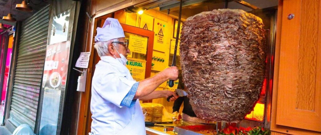 - Krojenie: Gdy zewnętrzna warstwa jest idealnie upieczona i chrupiąca, kucharz używa specjalnego, bardzo ostrego noża (lub elektrycznego noża) do odcinania cienkich, pionowych plastrów mięsa. W miarę jak mięso jest odcinane, kolejna warstwa piecze się, zapewniając ciągłą dostawę świeżo upieczonego kebaba.