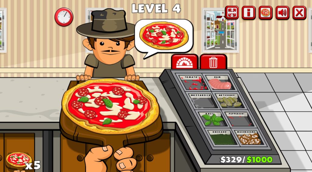 • Przygotowywanie Składników: Po przyjęciu zamówienia, gracz musi szybko i precyzyjnie wybrać odpowiednie składniki. Może to być ciasto, sos, ser, pieczarki, pepperoni, cebula i wiele innych. W niektórych grach liczy się nawet kolejność dodawania składników!