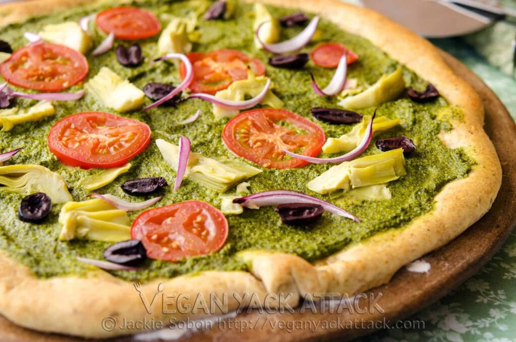 - Zamiast samej oliwy z oliwek, możesz użyć innych aromatycznych baz, takich jak toum (libański sos czosnkowy), zhough (ostro-ziołowy sos), olej bazyliowy lub oczywiście pesto, które jest doskonałym wyborem dla tej pizzy.