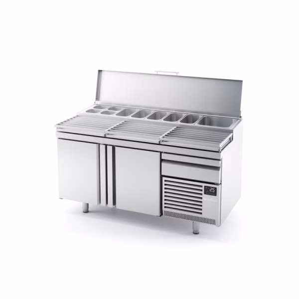 Stół chłodniczy do pizzy służy jako zintegrowana stacja robocza, łącząca blat do przygotowywania pizzy z chłodzonymi pojemnikami na składniki (sosy, sery, dodatki) oraz często z dolną komorą chłodniczą. Ma na celu zwiększenie efektywności, higieny i szybkości pracy w pizzerii.