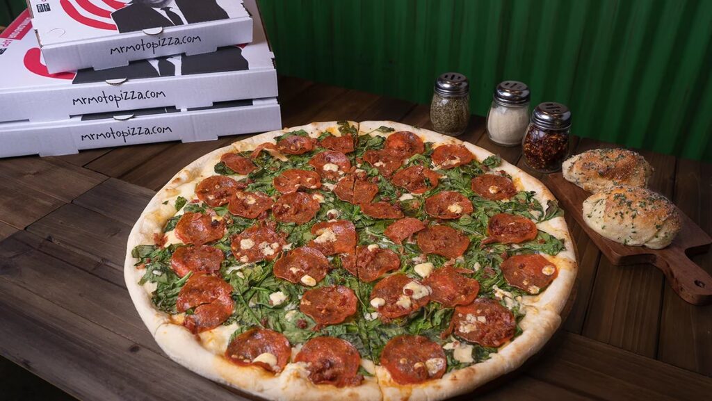 Do ich flagowych pizz należą: MR. MOTO (z włoską kiełbasą, hiszpańskim chorizo, burratą i domową pastą czosnkową), klasyczna pizza serowa ze stracciatellą oraz pizza z klopsikami, ricottą i pikantnym miodem. Oferują również „Pizzę Miesiąca” i „Rodzinne Specjały”.
