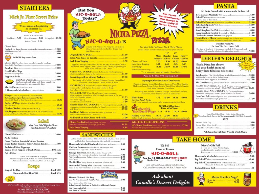 Nic-o-Boli to kultowy przysmak Nicola Pizza, który stał się ich znakiem rozpoznawczym. Jest to unikalna hybryda calzone i stromboli, wypełniona pyszną mieloną wołowiną i sosem pizzowym. Jest to danie, które od dziesięcioleci przyciąga klientów i jest uznawane za "must-try" podczas wizyty w Nicola Pizza.