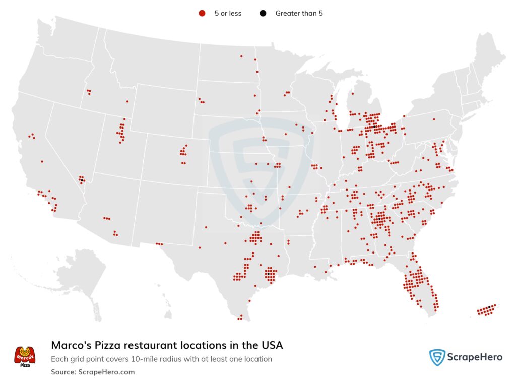 Na dzień 13 lutego 2025 roku, w Stanach Zjednoczonych funkcjonuje 1233 restauracje Marco's Pizza. Są one rozmieszczone w 36 stanach i terytoriach, z największą koncentracją w Teksasie, Florydzie i Ohio. Sieć stale się rozwija, otwierając nowe placówki w różnych regionach kraju.
