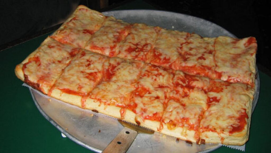 - To unikalna, głęboko zakorzeniona lokalna tradycja Old Forge. Nazwa „taca” (ang. „tray”) odnosi się do prostokątnego kształtu pizzy i sposobu jej serwowania, celowo odróżniając ją od konwencjonalnych, okrągłych „placków” pizzy spotykanych w innych regionach. Jest to część tożsamości tego stylu.