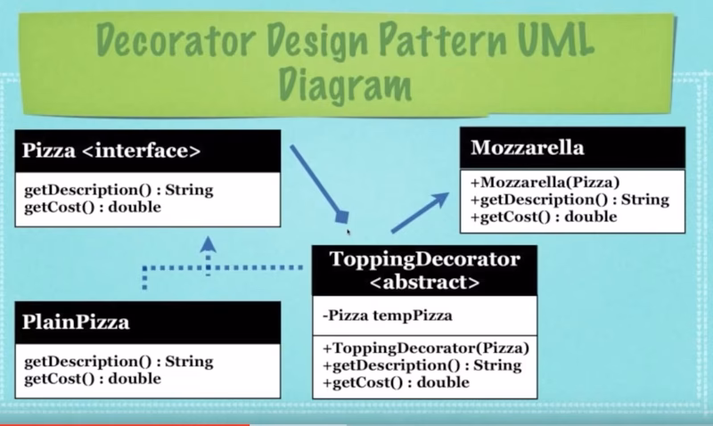 }Klasa PizzaDecorator jest abstrakcyjna, ponieważ sama w sobie nie dodaje żadnej konkretnej funkcjonalności, ale stanowi podstawę dla wszystkich konkretnych dekoratorów.