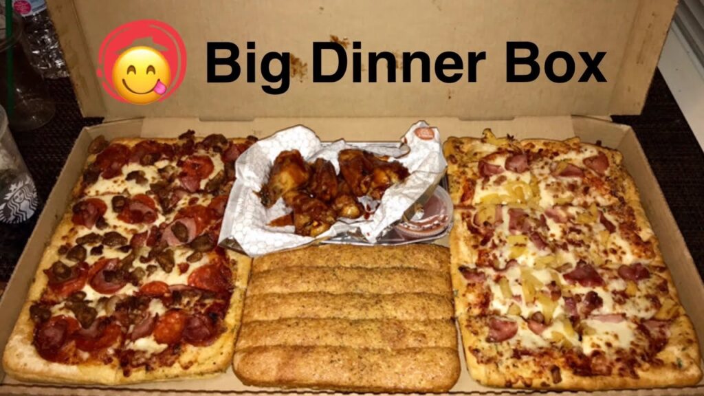 Big Dinner Box oferuje trzy główne warianty: z makaronem (dwie średnie pizze, pięć paluszków chlebowych, makaron Tuscani Meaty Marinara lub Creamy Chicken Alfredo), ze skrzydełkami WingStreet (dwie średnie pizze, pięć paluszków chlebowych, osiem skrzydełek z kością lub bez kości w wybranym smaku) oraz z dodatkowymi pizzami (trzy średnie pizze).