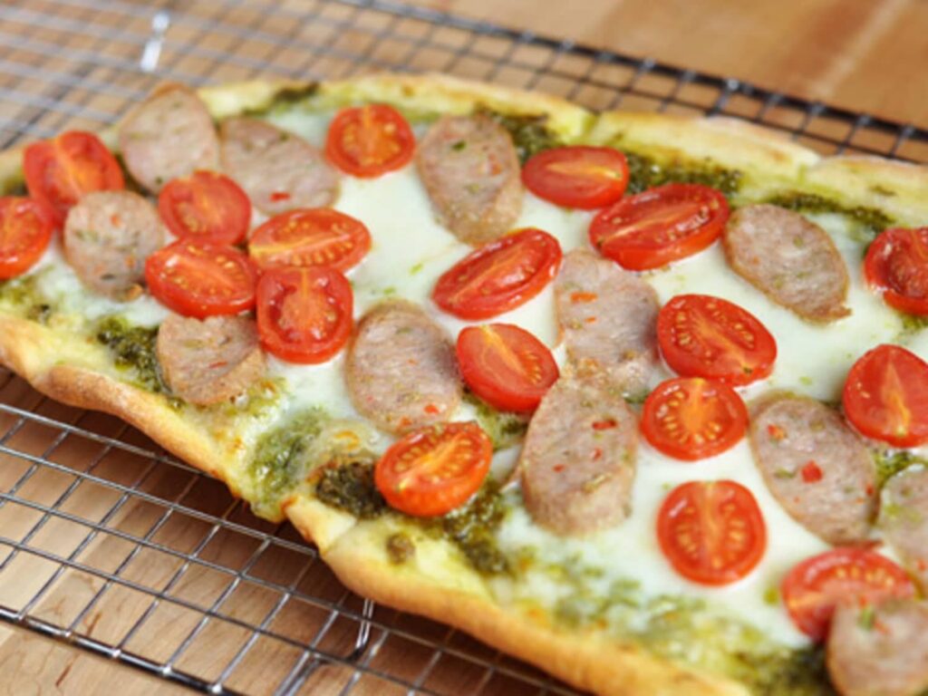 Nie jest to bezpośredni zamiennik sosu pomidorowego, ale uwielbiamy każdy rodzaj pizzy z serem, niezależnie od sosu. Ta wersja wymaga skropienia ciasta extra virgin oliwą z oliwek z pieczonym czosnkiem i świeżymi ziołami lub bezpośrednio sosem pesto na cieście do pizzy (lub podpłomyku). Może to być nietypowy zamiennik sosu do pizzy, ale z pewnością pasuje do klasycznej pizzy, zwłaszcza jeśli cenisz sobie prostotę i świeżość składników. Pesto, ze swoją bazylią, orzeszkami piniowymi i parmezanem, dodaje pizzy śródziemnomorskiego charakteru i intensywnego aromatu, idealnego dla miłośników ziół.