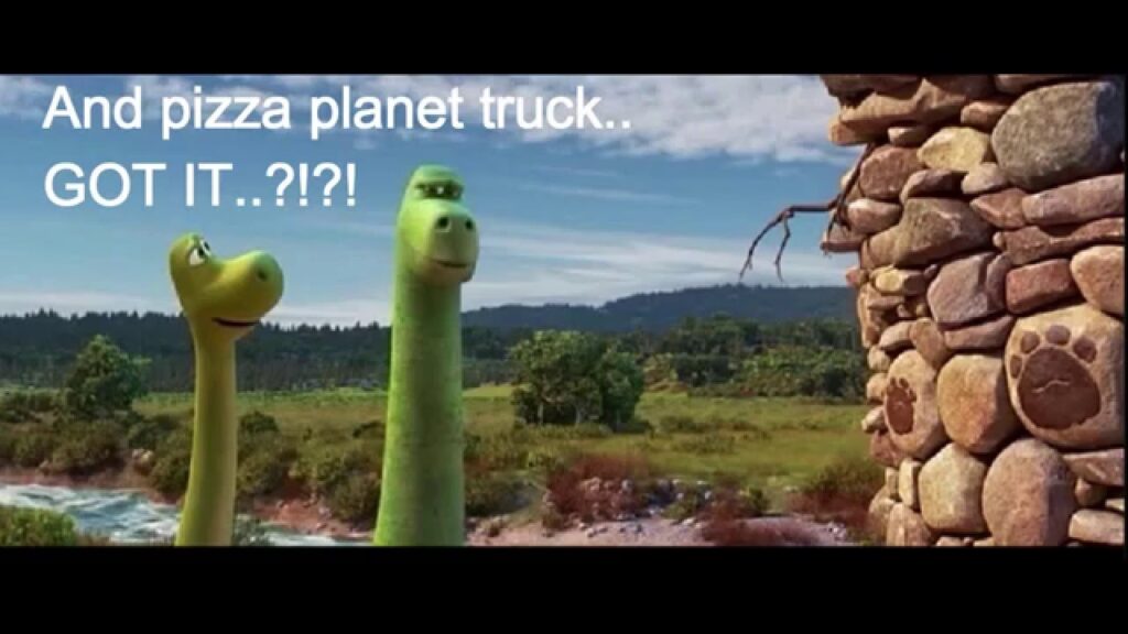 - Dobry Dinozaur (The Good Dinosaur, 2015): Ponownie Pixar musiał wykazać się dużą kreatywnością, aby umieścić ciężarówkę w filmie bez pojazdów. To, co mieli, to skały, i właśnie tam można dostrzec sprytną, nieco awangardową ciężarówkę do pizzy w formacji skalnej.