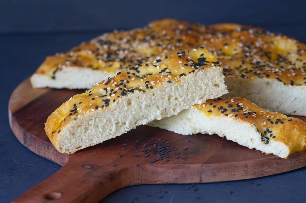 - Przygotowanie do pieczenia: Delikatnie naciśnij opuszkami palców ciasto, tworząc charakterystyczne ukośne lub kratkowe linie na powierzchni. Posmaruj chleb cienką warstwą oliwy z oliwek. Posyp obficie sezamem i nasionami czarnuszki (Nigella seeds) – to doda autentycznego smaku i aromatu.