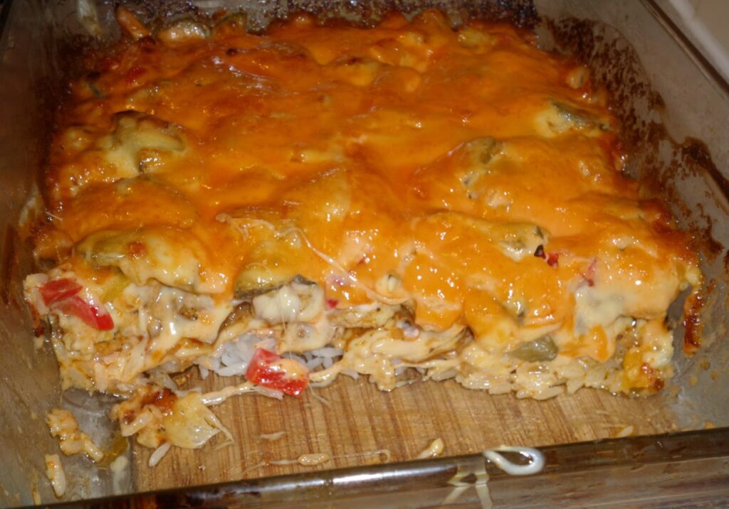 Warzywa dodają zapiekance świeżości, chrupkości i pięknych kolorów, stanowiąc doskonałe uzupełnienie dla mięsa i ryżu.